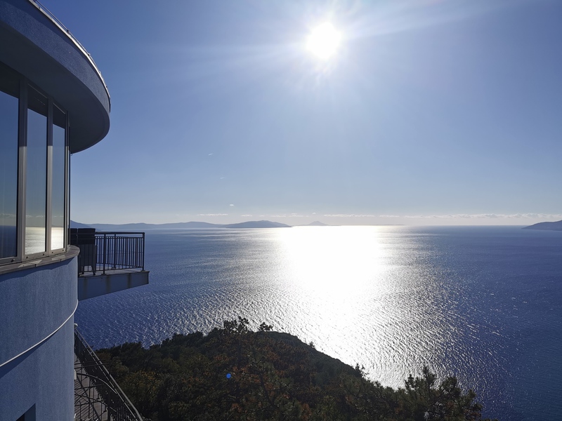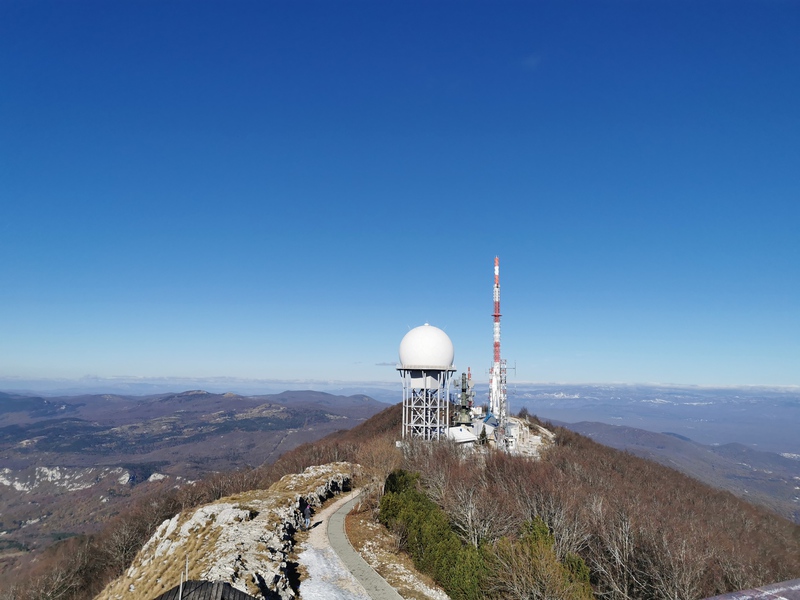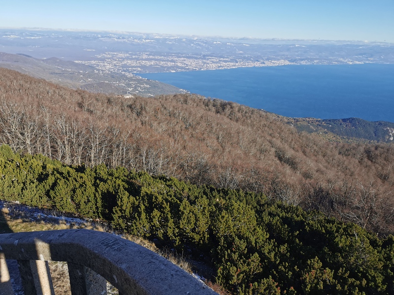 Hier oben ist es knackig kalt, der Wind pfeift uns um die Ohren und die Augen tränen durch den Wind. Wir sehen im Westen die Bergspitzen der Dolomiten, im Norden die Friulanischen Alpen, traumhafte Ausblicke auf die unberührten Wälder Istriens, die Insel Cres liegt im spiegelnden Meer, die Kvarner Bucht mit Opatija und Rijeka liegt vor uns und wir sehen sogar die Südspitze Istriens.